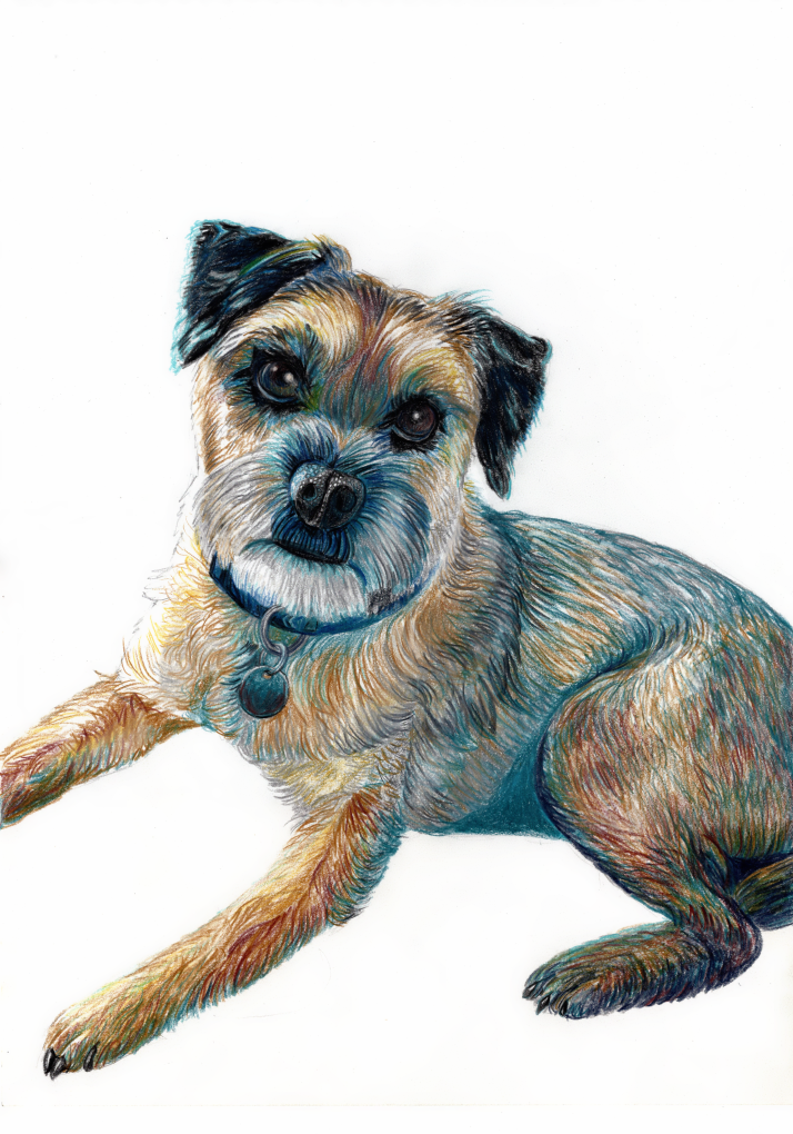 The model for this piece was Pixie, the Border Terrier. Originally drawn in coloured pencils the print faithfully reproduces every line. You can see the love and adoration in her puppy-dog eyes.