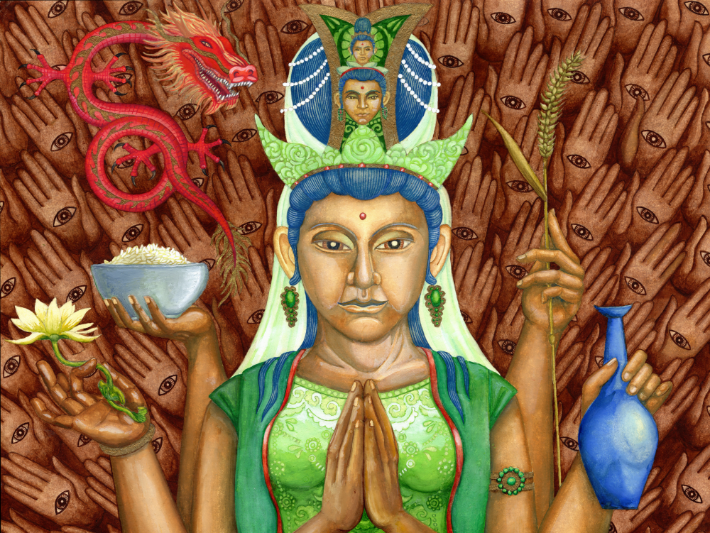 In an attempt to understand the needs of so many, her head split into pieces. The Buddha of eternal life, Amitabha (aka Amitayus) made each piece a head, which is why she is depicted with multiple heads. In the legend the number varies; there are three in this painting.