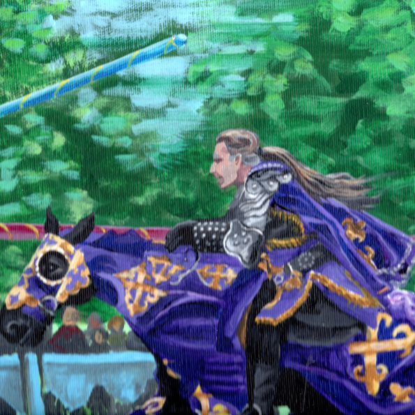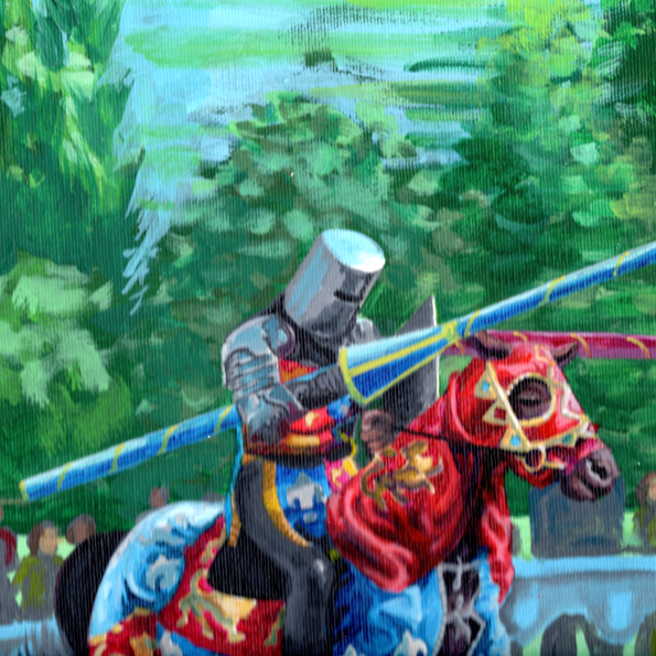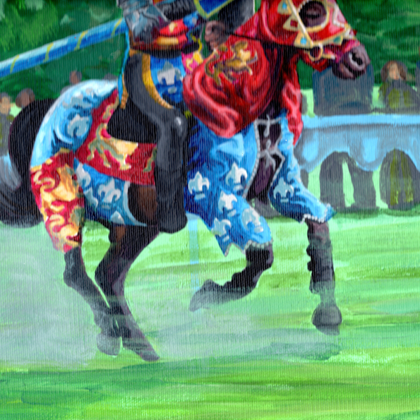 The artist, Amy Letts, uses a variety of brushstrokes to convey the scene. The background is loose with bold, expressive gestures repressenting speed. The crowd is a sea of indistinct faces reminiscent of Lowry’s ‘Matchstick men’. By contrast the knights and their horses are exquisitely detailed and highly realistic.