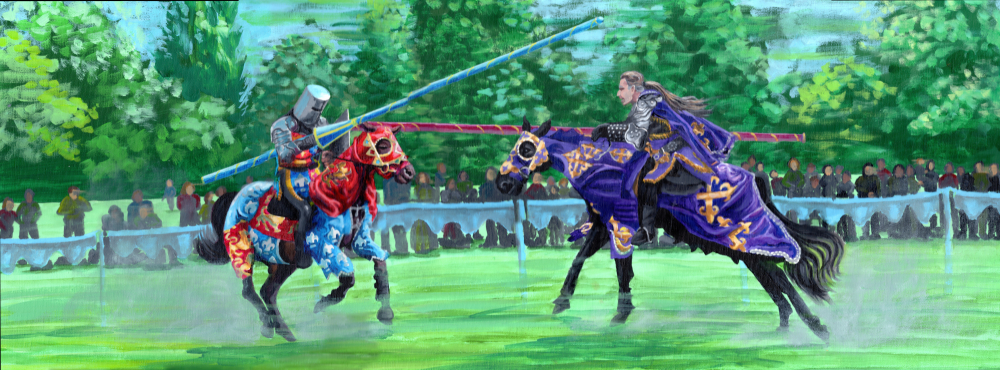 ‘Jousting Knights’ is an original panoramic painting created using acylic paints on canvas. Inspired by the Jousters at Blenheim Palace and their colourful pagentry, this painting captures the excitement of the event and engages the viewer in a story.